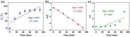 Fitting procedures of the (a) zero-, (b) first-, and (c) second-order reactions at the optimum conditions (pH = 8, catalyst dose = 0.02 g, and dye concentration = 100 mg L−1). Error bars represent the standard deviations of duplicate runs.