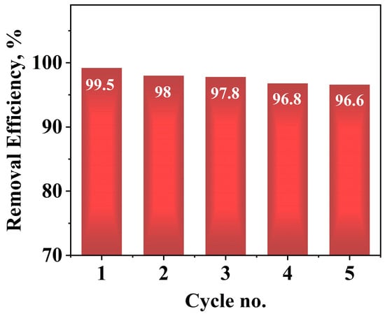 To evaluate the recyclability and stability of the as-synthesized ZnO NP photocatalyst, tests were conducted by executing recycling reactions five times for the photodegradation of CR dye under a UV-VIS light source. As shown in Figure 9, no noticeable loss of the photocatalytic activity of the ZnO NPs was observed for the CR dye degradation reaction after repeated cycles. This indicates that ZnO has good recyclability and stability and could be a potent material for practical photocatalysis applications.