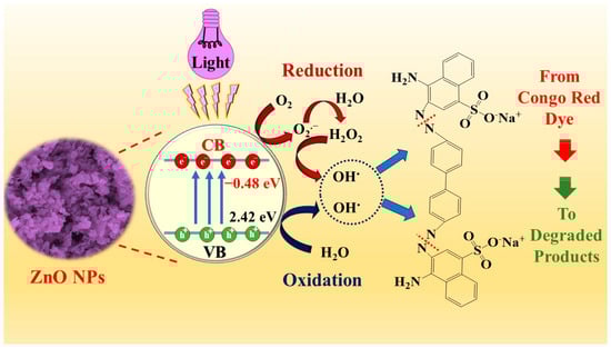 Figure 10 represents the CR dye photocatalytic degradation mechanism using a ZnO NP catalyst. Based on several studies, violet light can transfer electrons from the VB to the CB [71,72]. This creates holes (h+) and electrons (e−) on the surface of the Zn NP catalyst, which is a vital part of breaking down the CR dye. The diazo groups in the CR dye are cleaved due to the generation of •OH radicals on the surface of the photocatalyst, which arises via the oxidation of the H2O molecule [73,74]. Furthermore, a photoinduced electron transforms the adsorbed O2 molecule, forming O•2− radicals via the reduction process. The O•2− radical then reacts with the H2O molecule, forming an H2O2 molecule. This molecule is further reduced by electrons, leading to the production of •OH radicals. Following a sequence of oxidation reactions, the CR dye converts into carbon dioxide (CO2), H2O, and non-toxic molecules.