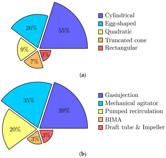 A graphical summarization is displayed in Figure 2a,b for both the frequency of the geometric reactor shape and the AD mixing approaches, respectively. It is noted that the majority of the investigated plants (55%) employ a cylindrical-based reactor geometry. While evaluating the investigated cylindrical AD towers in this manuscript and in the recent literature, no specific recommended diameter–height ratio can be generalized, but in general AD towers tend to be designed vertically with a larger height than diameter. Besides the simple and well-tested cylindrical shapes, egg-shaped AD designs (26%) were also common and widely used as the state-of-the-art in AD design within this study. While again no specific ratio in geometry is widely applied, most egg-shaped reactors are used in combination with draft tube mixing or aligned inlet configuration [3,35]. Quadratic (9%) and rectangular tanks (3%) are more commonly utilized for smaller AD volumes. While truncated cone geometries (7%) relate to a distinct tapered reactor design, most cylindrical AD towers also offer a tapered contour at the bottom to decrease dead zones.