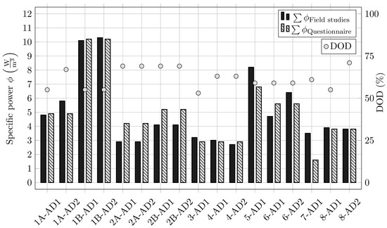 Comparison of the power rating provided by plant operators and of the measured in-field power demand using a Fluke Energy Logger 1732 v2.3. DOD is also highlighted for the specific AD towers.