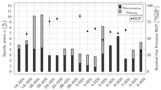 Comparison of specific power demand required for mixing and recirculation using experimentally determined data displayed in Table 2. RGP is additionally displayed for individual AD towers. Note that for serial operation mode, RGP is only given for final AD stage.