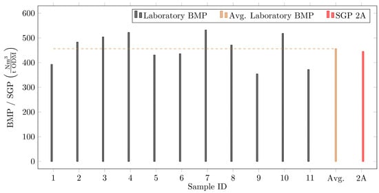 To examine the necessity of additional impeller mixing, a detailed investigation was conducted at Plant 2 to assess the potential issue of overmixing. As demonstrated in Table 2 (data of 2A and 2B), the required specific power for mixing ∑ΦF.E decreased per AD from 4.1 W m−3 to 2.9 W m−3 due to the termination of the additional impeller mixing through a draft tube. This results in a short-term reduction in the required mixing power demand of approximately 30%. The monitored biogas remained constant before and after the transition, with no significant fluctuations throughout the period of one year. The SGP provided by the plant was 445 Nm3 CH4/t ODM. To ensure the sufficiency of the AD mixing induced solely via pumped recirculation, the BMP determined in laboratory experiments compared to the plant’s gas production is displayed in Figure 6. Evaluation of the gas production from the AD mixed solely with recirculation is displayed for 11 samples that were taken over a span of 16 weeks and digested under ideal laboratory conditions to estimate the BMP. Fluctuations in the samples, as highlighted in Figure 6, are attributed to a less ideal intermixing of primary and excess sludge when the samples were taken.