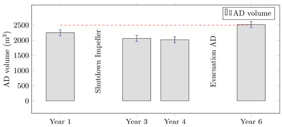 The comparison shows good agreement between the BMP derived through the ideal lab-scale AD (avg. laboratory BMP = 456 Nm3 CH4/t ODM) and the SGP of the real AD towers (SGP of Plant 2A = 445 Nm3 CH4/t ODM). Small deviations between the gas potentials highlight sufficient intermixing and thorough processing of the organic matter. Regarding biogas production, sludge mixing based solely on recirculation was proven to be sufficient, and additional impeller mixing was deemed unneeded for this specific case. Regarding settlement and the long-term maintenance of the AD towers, the ongoing study did not reveal significant alterations in the hydrodynamic behavior of solid particles within the investigated period. The available AD volume is regularly determined using tracer-based tests. As highlighted in Figure 7, the available AD volume is shown for specific time points before and after impeller shutdown, as well as after complete AD evacuation.