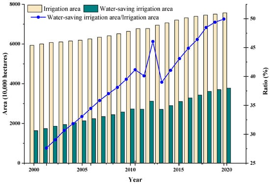 The growth of irrigated farmland area and water-saving irrigation area in China [16].
