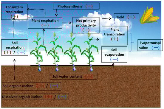 Agricultural ecosystems, as both carbon sources and carbon sinks, have become a hot spot. The photosynthetic uptake of CO2 by crops endows agricultural ecosystems with a robust carbon sequestration effect [53]. Concurrently, soil respiration and plant autotrophic respiration directly lead to carbon emissions [54]. Thus, agroecosystems are endowed with the dual characteristics of carbon uptake and carbon emission. Photosynthesis is highly sensitive to fluctuations in soil moisture through stomatal and biochemical reactions, which significantly impacts crop growth [55]. Compared with traditional flood irrigation, drip-irrigated crops under sufficient irrigation conditions exhibit markedly increased photosynthetic rates and stomatal conductance [56]. The net photosynthesis is higher (about 15%) in drip irrigation in comparison with flood irrigation [34]. Drip irrigation has an effect on the physiological characteristics of spring maize, and the photosynthetic area of the lower leaf and the photosynthetic capacity of the upper middle leaf are increased [57]. Additionally, the maximum photosynthetic rate and maximum carboxylation rate of crops are significantly enhanced by 21.1% and 10.7%, respectively [58]. Due to the amplified carboxylation efficiency under drip irrigation conditions, the rate of photosynthesis in leaves is further increased, thereby enhancing canopy photosynthesis by 42.1–48.1% [27]. Increasing the frequency of drip irrigation fertilization could prolong the time of high-level photosynthesis [59], which is beneficial for increasing the accumulation of photosynthetic products. In addition, drip irrigation increases the leaf area index of crops, as it determines the photosynthetic area [60], which may also explain why drip irrigation can fix more CO2 than flood irrigation. The promotion effect of drip irrigation on the photosynthetic rate is more prominent in arid farmland. If the frequency of drip irrigation is low, then it is easy to cause a crop water deficit, which has an adverse effect on the photosynthetic rate [61]. Analyzed through the carbon sequestration potential of farmland, drip-irrigated fields have a higher net ecosystem production (NEP) compared with traditional flood irrigation, indicating greater carbon sequestration potential [61]. This is predominantly achieved by diminishing soil heterotrophic respiration and concurrently enhancing the net primary production (NPP) [62,63]. In summary, the environment created by drip irrigation is more conducive to the absorption of atmospheric CO2 when it is conducive to the growth and development of crops.