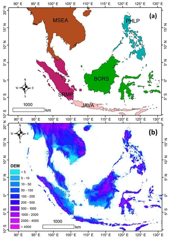 Study area of Southeast Asia: (a) five geographical masks for regional analysis including Mainland Southeast Asia (MSEA), Sumatra and Malay Peninsula (SRMP), Java Island (JAVA), Borneo and Sulawesi Islands (BORS), and the Philippines (PHLP); and (b) digital elevation map for the study region. The country administrative boundaries were accessed from open data provided by the World Food Programme (a UN agency) at https://public.opendatasoft.com/explore/dataset/world-administrative-boundaries (accessed on 30 May 2023). The digital elevation data was freely available from HydroSHEDS at https://www.hydrosheds.org/hydrosheds-core-downloads (accessed on 30 May 2023).