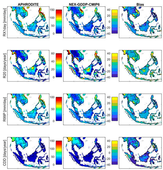 Comparison of precipitation indices from APHRODITE with historical NEX-GDDP-CMIP6 dataset. The bias was calculated by using the NEX-GDDP-CMIP6 dataset subtracted from the APHRODITE dataset.