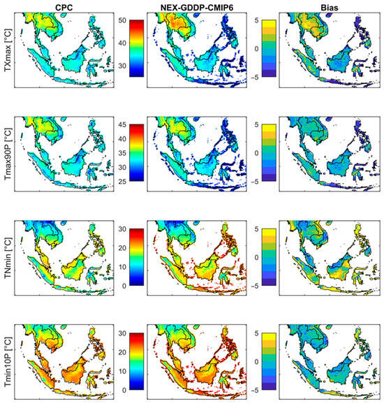 Comparison of temperature indices from CPC with historical NEX-GDDP-CMIP6 dataset. The bias was calculated by using the NEX-GDDP-CMIP6 dataset subtracted from the CPC dataset.