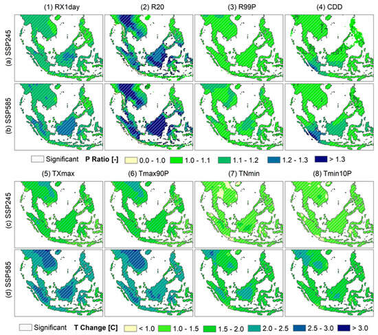 Figure 4a,b spatially illustrates the distribution of precipitation changes, as determined by the ensemble mean of 29 GCMs from the NEX-GDDP-CMIP6 dataset. These changes are observed over the future 65-year periods (2021–2085) when compared to baseline 65-year periods (1950–2014). The spatial patterns mirror the temporal analysis previously discussed for each region within SEA. Notably, we observe clear increases in change ratios across all regions within SEA. The most significant increase is observed in R20, which covers central MSEA and the main island of the BORS region, with a ratio exceeding 1.3. For RX1day, we anticipate an increase of approximately 1.1 to 1.2 for most of the region, and 1.2 to 1.3 for specific areas within the BORS region. Regarding the change ratio for R99P and CDD, we expect it to range between 1.0 and 1.1 for nearly all regions within SEA. It is important to highlight that all four precipitation indices exhibit statistically significant changes to the K-S test, as depicted in Figure 4a,b.