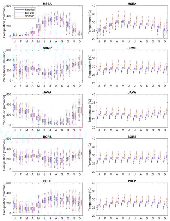 We have conducted a detailed examination of seasonal variations in precipitation and temperature across the five primary regions in SEA. Figure 5 provides a comprehensive depiction of monthly precipitation and temperature variations in the short-term future (2061–2100) relative to those in the historical period (1950–2014). In the MSEA region, precipitation is suggested to drop by 5.26 to 9.43% for SSP245 and 9.04 to 10.89% for SSP585 during the tail end of the dry season and the onset of the rainy one, specifically from March to May. However, an increase in precipitation is anticipated during the late rainy season, with an uptick of 6.04 to 8.96% (SSP245) and 8.86 to 15.04% (SSP585) observed between September and November. Remarkably, a decline in monthly precipitation is found during the late southwest monsoon (August to October) in the SRMP region, with a range of 0.45 to 5.04% (SSP245) and 5.99 to 11.04 (SSP585). This is followed by an increase in the early northeast monsoon (November to December), with an approximate rise of 3.12 to 8.20% for SSP245 and 4.65 to 9.31% for SSP585.