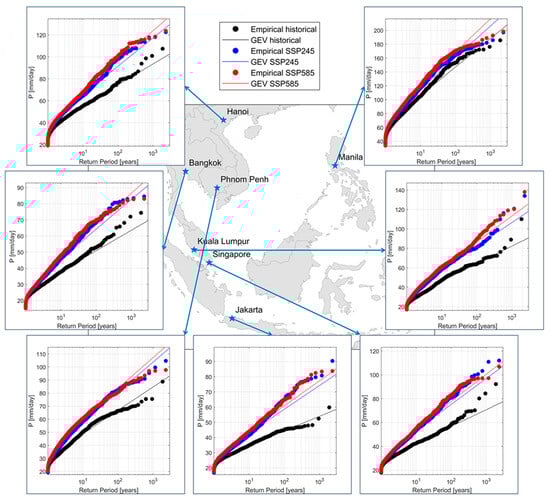 Changes in extreme and frequency of precipitation in SEA cities. The dots and lines represent the empirical and GEV fitting for the future projections under the SSP245 (blue) and SSP585 (red) scenarios compared to the historical period (black).