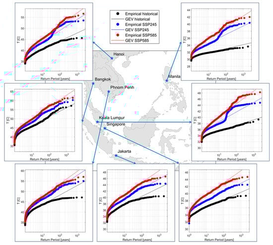 We have further broadened our research scope to encompass the distinctive climatic characteristics of several prominent cities in SEA, encompassing Bangkok, Hanoi, Jakarta, Kuala Lumpur, Manila, Phnom Penh, and Singapore. Our goal is to investigate extreme weather occurrences associated with specific return periods determined through fitting GEV curves. We have extracted climatological data for each city and its suburban areas using 3 × 3 grid cells from NEX-GDDP-CMIP6 dataset. Our analysis focuses on variations in the annual maximum series (AMS) of precipitation and temperature at daily scale with 2-, 10-, 50-, and 100-year return periods. We draw comparisons between the historical climate patterns and future predictions based on two scenarios, namely SSP245 and SSP585. Lastly, we conducted an examination of extreme temperatures in the seven cities by analyzing their daily AMS and GEV fitting curves.