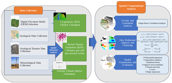 - By overlaying the extreme climate characteristic indicators of each station with the natural geography and geological disaster layers, a database of extreme climate indicators, natural geographic factors, and geological disaster density distribution was obtained. The correlation and significance between geological disaster density and each factor were then calculated.