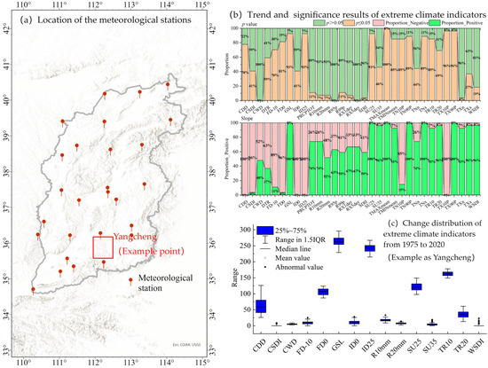 Significant trends were observed in multiple extreme climate indices in Shanxi Province. Particularly, the TMAXmean index showed significant changes at all stations and reached 100%, indicating that extreme high-temperature events are widespread in Shanxi Province [32]. Additionally, 62.55% of the indicators for the positive effect of precipitation exhibited an upward trend, but only 37.45% reached significant levels, suggesting that extreme precipitation events may show a more significant increasing trend in the future [33]. Meanwhile, indicators for the negative effect of precipitation exhibited a 100% downward trend, and 77.78% reached significant levels. This means that although the current changes in the positive effect of precipitation have not reached significance, the frequency and intensity of extreme precipitation events may further increase over time.