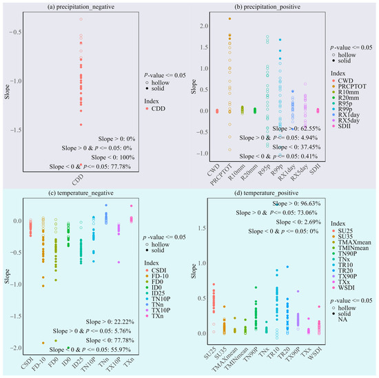 The extreme climate indicators in Shanxi Province are divided into two main categories: temperature and precipitation. Based on the definitions of each indicator, it can be determined whether the indicator represents a positive or negative change in temperature and precipitation, as shown in Table 1. According to the calculation results of extreme climate indices, the characteristics of extreme climatic changes in Shanxi Province are obtained, as illustrated in Figure 3. For precipitation, 62.55% of the indicators with a positive effect show an increasing trend, but only 37.45% of these positive effect indicators reach a significant level. This indicates that while there is an increasing trend in extreme precipitation events in Shanxi Province, the overall change is not statistically significant. Conversely, the indicators with a negative effect on precipitation show an absolute (100%) decreasing trend, with 77.78% of these indicators reaching significant levels. Analyzing the positive and negative effect indicators of precipitation comprehensively, although the increasing trend of positive effects has begun to manifest, showed that it has not yet reached a significant level. It can be inferred that if this trend continues, extreme precipitation events may show more significant increasing changes in the future. The significant decrease in negative effects also suggests that the overall precipitation pattern may be adjusting, and the frequency and intensity of extreme precipitation events may further increase in the future. For temperature, 96.3% of the indicators with a positive effect show an increasing trend, with 73.6% of these positive effect indicators reaching significant levels. This means that extreme temperature events symbolizing high temperatures in Shanxi Province generally show a significant increasing trend. On the other hand, 77.8% of the indicators with a negative effect on temperature exhibit a decreasing trend, with 55.97% of these negative effect indicators reaching significant levels. This indicates that extreme temperature events symbolizing low temperatures in Shanxi Province generally show a significant decreasing trend. From the analysis of the positive and negative effect indicators of temperature, it is evident that the temperature in Shanxi Province is increasing significantly, and there is a need to pay attention to the hazards of extreme high temperature events in the future.