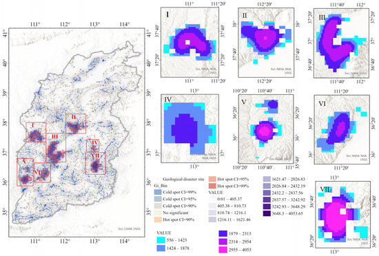 The spatial distribution of approximately 11,000 geological disaster points in Shanxi Province, along with the cold- and hotspots of geological disasters and kernel density analysis results, are shown in Figure 4. The analysis reveals that the hotspot areas with a significance level of 90% cover approximately 10,000 km2, with a kernel density range of 556.51–4053.65 and a number density range of 0.16–1.32. These significant hotspot areas account for about 6.42% of the province’s total land area and exhibit clustered and uneven spatial distribution. They are mainly located in the central north–south region of Shanxi Province and can be divided into seven areas from north to south and west to east (Figure 4), with areas of approximately: 0.158 × 104 km2, 0.14 thousand km2, 0.29 × 104 km2, 0.041 × 104 km2, 0.134 × 104 km2, 0.112 × 104 km2, and 0.107 × 104 km2, respectively. The kernel density ranges are 684–2593, 903–2977, 641–2884, 1220–2090, 882–3042, 894–2439, and 773–4053, with the average kernel densities of 1981.6, 2028, 2068.3, 1738.7, 2005.6, 1830.5, and 2381.1, respectively. It can be observed that Area III has the largest area and a relatively high kernel density, while Area VII has the highest density of geological disasters, with its number density exceeding 1.0. It is recommended to strengthen geological disaster monitoring and preventive measures in these key areas, especially in zones with higher kernel densities. Particular attention should be given to Area III, which has a large hotspot area and high density, and Area VII, which has a high density of geological disasters. Enhanced monitoring and prevention efforts are crucial in these regions.