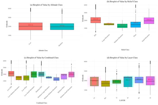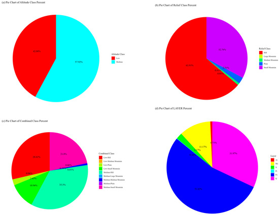 Extracting the significant hotspot areas of geological disasters in Shanxi Province, these areas were divided into pixel units and overlaid with the geological strata, DEM, and topographic relief maps of Shanxi Province to obtain the geographical overview of the geological disaster hotspots, as shown in Figure 5. From the perspective of elevation (Figure 5a), geological disasters are more likely to occur in mid-elevation areas (500–1500 m), with significant hotspot geological disasters at mid-elevation accounting for 57.92% of the total, which is close to the total area of mid-elevation regions in Shanxi Province (67.6%). This indicates that, relative to the total area of Shanxi Province, more geological disaster hotspots are located in low-elevation regions. In terms of topographic relief (Figure 5b), significant hotspot geological disasters occurring in hilly plateaus and low mountains account for 96.66% of the total, far exceeding the area proportion of these two topographic types in Shanxi Province. This suggests that geological disaster hotspots are more concentrated in areas with a topographic relief of 30–200 m (63.91%) and 200–500 m (32.75%). Regarding landform types (Figure 5c), geological disaster hotspots are more concentrated in mid-elevation hills and plateaus (35.3%). From the perspective of geological conditions (Figure 5d), Q (Quaternary) and Pz (Paleozoic) strata concentrate 85.42% of the geological disaster hotspots, with these two strata accounting for 40.63% and 29.78% of the area of Shanxi Province, respectively. This indicates that geological disaster hotspots are more likely to occur in areas with Q strata.