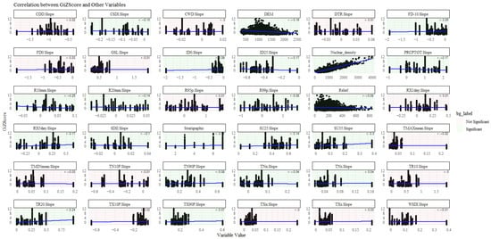 By overlaying the Z-score of the geological disaster hotspot analysis in Shanxi Province, kernel density values, DEM, relief degree, and 32 meteorological indicator values from the meteorological station within the corresponding Thiessen polygons, a database of influencing factors for geological disaster density was constructed. First, the correlation between the Z-score and influencing factors was analyzed, as shown in Figure 7. From Figure 7, it is evident that a total of 21 indicators have a significant correlation with the Z-score: Temperature Positive Correlation (temperature_positive): SU25.Slope (0.14), SU35.Slope (0.30), TN90P.Slope (0.08), TNx.Slope (0.03), TR20.Slope (0.24), and TX90P.Slope (0.07). This indicates that these temperature-positive climate indicators have a significant positive correlation with geological disaster hotspots. Temperature Negative Correlation (temperature_negative): CSDI.Slope (−0.15), FD-10.Slope (0.05), ID0.Slope (0.09), ID25.Slope (−0.17), TNn.Slope (−0.04), and TXn.Slope (−0.04). Overall, these indicators show a negative correlation with geological disaster hotspots, suggesting that increases in these indicators may be associated with a reduction in geological disaster hotspots. Precipitation Positive Correlation (precipitation_positive): PRCPTOT.Slope (−0.17), R10mm.Slope (−0.25), R20mm.Slope (−0.14), R99p.Slope (0.08), and RX5day.Slope (0.17). It can be observed that indicators representing large precipitation events (PRCPTOT, R10mm, and R20mm) have a significant negative correlation with geological disaster hotspots, whereas indicators representing extreme rainfall intensity (R99p and RX5day) have a significant positive correlation with geological disaster hotspots. This implies that, over the long term, higher total precipitation and frequent large rainfall events are associated with a reduction in geological disaster hotspots. In contrast, extreme rainfall events (i.e., intense rainfall over a short period) are associated with an increase in geological disaster hotspots.
