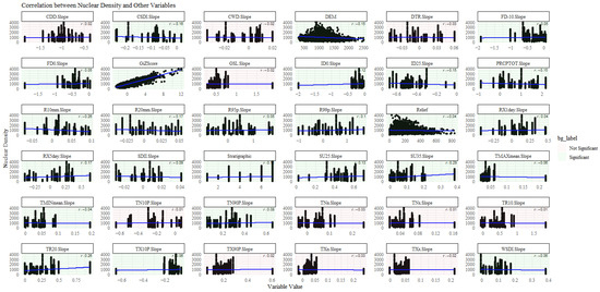 The correlation between kernel density and influencing factors is shown in Figure 8. It can be observed that a total of 21 indicators have a significant correlation with kernel density. Among these significantly correlated indicators: Temperature Positive Correlation (temperature_positive): SU25.Slope (0.13), SU35.Slope (0.29), TN90P.Slope (0.08), TR20.Slope (0.26), and TX10P.Slope (0.06). This indicates that these temperature-positive climate indicators have a significant positive correlation with geological disaster hotspots. Temperature Negative Correlation (temperature_negative): CSDI.Slope (−0.16), FD-10.Slope (0.05), ID0.Slope (0.12), ID25.Slope (−0.15), TMAXmean.Slope (−0.06), TMINmean.Slope (−0.04), and WSDI.Slope (−0.06). Overall, these temperature-negative indicators show a negative correlation with geological disaster hotspots, suggesting that increases in these indicators may be associated with a reduction in geological disaster hotspots. Precipitation Positive Correlation (precipitation_positive): R95p.Slope (0.05), R99p.Slope (0.10), RX1day.Slope (0.04), and RX5day.Slope (0.17). These indicators have a significant positive correlation with geological disaster hotspots, indicating that extreme rainfall events (i.e., intense rainfall over a short period) are associated with an increase in geological disaster hotspots. Precipitation Negative Correlation (precipitation_negative): PRCPTOT.Slope (−0.15), R10mm.Slope (−0.26), and R20mm.Slope (−0.17). These indicators have a significant negative correlation with geological disaster hotspots, suggesting that higher total precipitation and frequent large rainfall events are associated with a reduction in geological disaster hotspots.