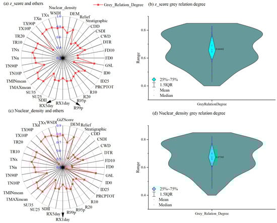 Based on the constructed database of geological disaster density influencing factors, the grey relational degree between the Z-score and kernel density with other influencing factors was analyzed, as shown in Figure 9. For the Z-score, the factors with high relational degrees are: TXn.Slope (0.83), TXx.Slope (0.82), TMAXmean.Slope (0.81), GSL.Slope (0.81), and TX90P.Slope (0.81). These high relational degree factors indicate that extreme temperatures (both extremely low and high temperatures) and changes in the growing season have a significant impact on the occurrence of geological disasters. For kernel density, the factors with high relational degrees are GSL (0.80), TXn.Slope (0.83), TX90P (0.80), TXn (0.82), and TXx (0.81), further clarifying that the occurrence of geological disasters is closely related to extreme temperature events (such as extreme high and low temperatures) and the growing season.
