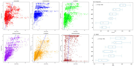 Based on the results of the relational degree analysis, six extreme climate factors related to geological disaster density were selected to construct Z-score and kernel density models using linear regression, polynomial regression, GAM (Generalized Additive Models), random forest, SVM (Support Vector Machine), and neural networks, as well as Lasso and Ridge regression models. The simulation results of these models are shown in Figure 10. From the Mean Absolute Error (MAE) results, the random forest (rf) model performed the best, with an average MAE of 1.15, significantly lower than the other models. This indicates that the random forest model has a smaller prediction error and higher accuracy. Polynomial regression (poly) and the generalized additive model (gam) followed closely, with average MAEs of 1.35 and 1.32, respectively. The performances of the linear regression (lm) and support vector machine (svm) were similar, at 1.43 and 1.18, respectively. The neural network (nn) had the highest average MAE of 1.47, indicating the largest prediction error. In terms of the Root Mean Square Error (RMSE) metric, the random forest (rf) model again performed best, with an average RMSE of 1.57, significantly lower than the other models, indicating its advantage in handling the sum of squared errors. Polynomial regression (poly) and the generalized additive model (gam) had average RMSEs of 1.79 and 1.76, slightly better than the support vector machine (svm) at 1.71. The linear regression (lm) and neural networks (nn) had relatively high average RMSEs of 1.91 and 1.93, respectively. The R2 value reflects the model’s explanatory power. In this metric, the random forest (rf) model also performed excellently, with an average R2 of 0.42, showing strong explanatory power. The polynomial regression (poly) and the generalized additive model (gam) had average R2 values of 0.24 and 0.27, respectively, indicating a good fit to the data. The support vector machine (svm) had an average R2 of 0.33, better than linear regression (lm) at 0.138. The neural network (nn) had the lowest average R2 of 0.16, indicating the weakest explanatory power.