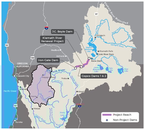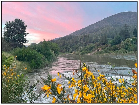 - Werk, J. This Year’s Salmon Run Is a Celebration along the Klamath River. Oregon Public Broadcasting, 6 May 2023. Available online: https://www.opb.org/article/2023/05/06/klamath-river-salmon-run-dam-removal-native-tribes-karuk-hoopa-yurok/ (accessed on 10 June 2024).