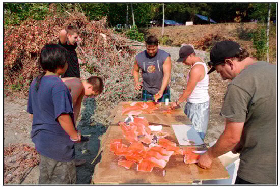 For the Karuk Tribe, whose culture is deeply connected to salmon, impairment of traditional foods and eco-cultural practices from dam construction and related developments has had profoundly negative consequences for health, livelihoods, and cultural continuity []. For example, the relatively recent construction of the Iron Gate Dam in 1964 dealt a compromising blow to the Spring Chinook salmon run, which was once a principal food source for the tribe and led to the decimation of the run by the 1970s, within the lifetime of today’s Karuk cultural practitioners. Following an accumulation of negative impacts, average yearly consumption of salmon has dropped from what was once estimated to be 450 lbs/person/year historically to less than 5 lbs/person/year today. At that same time, diabetes and other diet-related diseases have taken root in the community and now appear at disproportionately high rates among Karuk people [,,]. Negative impacts from Klamath dams include emotional trauma inflicted on tribal communities from catastrophes like the 2002 fish kill, when upstream water diversions for agriculture and poor water quality conditions culminated in a fish disease outbreak in the lower Klamath, with 34,000–78,000 adult salmon and steelhead dying without spawning [,].