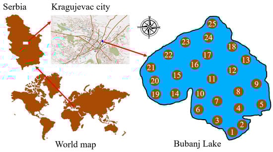 Bubanj Lake is approximately 2.7 ha in size with an average depth of 1.20 m. Its bed primarily consists of mud, which varies in thickness from 0.50 to 0.70 m. The primary sources of water for the lake include the “Bubanj” drinking water fountain and underground spring, in addition to precipitation. Situated in the city center, Bubanj Lake is bordered by busy roads on three sides. The lake is a well-visited tourist destination due to its natural beauty. Furthermore, the lake is also used for recreational sport fishing activities []. Despite its strategic location and potential importance for the surrounding area, Bubanj Lake has not been adequately researched. Moreover, urbanization poses numerous challenges, especially bearing in mind a high concentration of population in a small area, which requires a series of measures and procedures for building and organizing urban settlements, as well as measures to prevent impacts on the living environment.