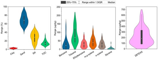 Pearson correlation analysis was performed to determine the relationship between BTEXS congeners and sediment characteristics and assess their origin in the sediment. The results are summarized in Table 4. Values of the correlation coefficient (r) below 0.5, between 0.5 and 0.7, and above 0.7 indicate weak, moderate, and strong correlations, respectively [].