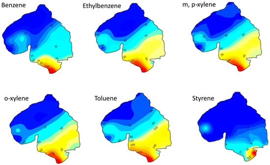 Benzene showed a slightly different color pattern to toluene, ethylbenzene, m,p-xylene, and o-xylene, indicating positive but weaker mutual associations. Moreover, these findings point out that the factor affecting benzene content and distribution in sediment was similar to some extent to the one affecting toluene, ethylbenzene, m,p-xylene, and o-xylene.