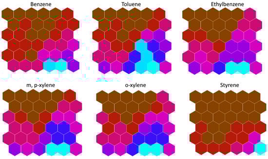 The relationships among BTEXS congeners can provide insights into their sources in sediments. However, SOM was employed to further examine the relationship between BTEXS and their sources. The bubble neighborhood function was trained on 6 variables and 25 observations. After multiple rounds of iterative training, the weight matrix for each variable was obtained, minimizing the quantization and topographic errors to 0.95 and 0.05, respectively. Consequently, SOM classification was achieved through a six-row by six-column arrangement with a hexagonal topology. The component planes of the SOM for BTEXS after training are illustrated in Figure 4, and the average distances between each neuron in the SOM component planes are presented in Figure S1. The weight vector value for each neuron is represented by different colors, where cyan indicates high values, while brown represents low values. Identifying correlations between variables can be achieved using a color gradient of each component plain, where identical or similar colors point to a positive correlation.