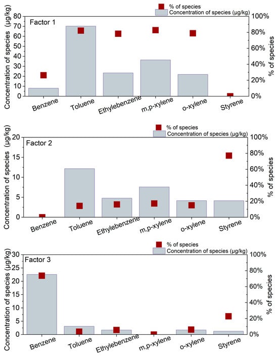 The factor profiles and contributions of each factor to the BTEXS concentrations in the sediments of Bubanj Lake are presented in Figure 5. Factors 1, 2, and 3 accounted for 59.2%, 23.4%, and 17.4% of the contribution rate, respectively, representing different BTEXS pollution sources.
