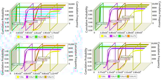 The HI and TCR values for both population groups were below the thresholds of 1 and 1.0 × 10−4, respectively, even at the 95th percentile. Moreover, the 95th percentile values of HIa, HIc, TCRa, and TCRc were 1.62 × 10−5, 1.51 × 10−4, 1.15 × 10−9, and 2.69 × 10−9, respectively. Therefore, there was no probability of exceeding the thresholds and developing non-carcinogenic diseases or cancer. Previous studies have reported that maintaining risks below the acceptable risk threshold at the 95th percentile can classify the health risks associated with different contaminants as acceptable []. However, children remain at higher risk, with the probabilistic health risk assessment validating the conclusions obtained through the deterministic approach.