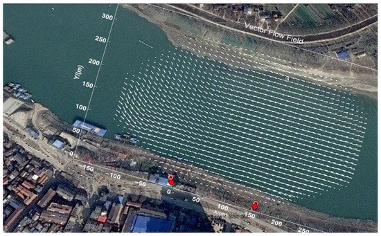 To validate the aforementioned method, the experimental data collected by the Ultra High Frequency (UHF) ground wave radar at the Xiantao section of the Han River (113°26′49.62″ E, 30°22′45.76″ N) from March to July 2018, operated by the Radar Signal Processing Laboratory of Wuhan University, was analyzed. The river width at the Xiantao hydrological station ranges from 250 m to 300 m and is located in a curved section of the river, making the flow direction more complex compared to straight river channels. According to historical data, the river flow rate in the Xiantao section of the Han River ranges from 500 to 10,000 cubic meters per second. The UHF radar uses a Frequency Modulated Interrupted Continuous Wave (FMICW) with a carrier frequency of 340 MHz and a bandwidth of 15 MHz, with a coherent accumulation time of 20 s. Two radars are deployed at the Xiantao hydrological station on the Han River, the largest tributary of the Yangtze River. Station A is located inside the hydrological station, with the receiving antenna about 10–15 m above the water surface, and Station B is constructed about 100 m downstream at a height of about 10 m above the water surface. Figure 3 shows the distribution diagram of the dual-station radar, and Figure 4 presents the cross-sectional schematic of the river under study, where the maximum water depth is about 30 m and the maximum width is about 300 m, characteristic of a wide and deep river channel.The relevant radar parameters are shown in Table 1. Figure 5 shows Study area of the river and the vector flow field of the river surface flow.