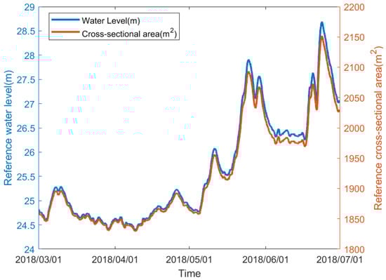 Figure 6 shows the data graph of water level and the cross-sectional area calculated using linear fitting provided by the Xiantao hydrological station during the radar operation period, with a resolution of 1 h. Figure 7 shows the cross-sectional flow velocity and water level range calculated before improvements, ranging from 24 to 29 m, and the river flow rate ranging from 500 to 3500 m3/s. The occurrence of high flow rates coincides with high water levels. The relationship between water level and flow rate cannot be described using a specific hydraulic model, which also contributes to the complexity of the river flow pattern in this region.