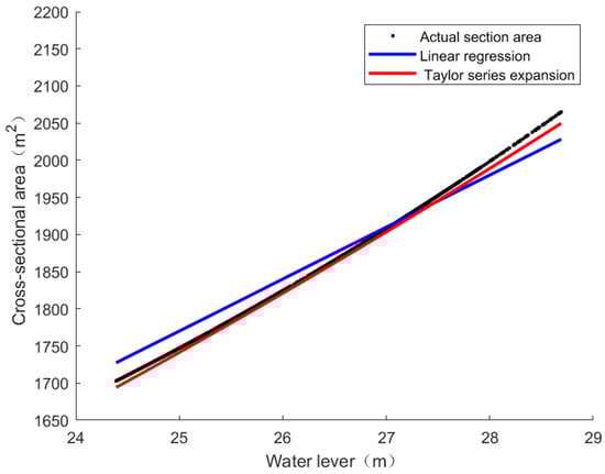 For the method proposed in this article, the relationship between cross-sectional area and water level is nonlinear. The relationship graph obtained by employing Taylor series expansion for cross-sectional area and water level is shown in Figure 10.