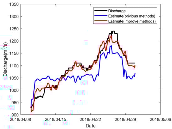 To illustrate the differences between the two methods using velocity-based metrics, Figure 11 and Figure 12 show the flow measurements for approximately one month during both the low-water and high-water periods. During this period, the flow rate changes from 900 to 1250 m3 during the low-water period, and from 1400 to 3200 m3 during the high-water period. Although both methods are very close to the true values, the errors in the method after improvement are smaller than those in the method before improvement.