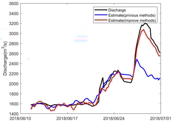 From Figure 11, Figure 12 and Table 3, it can be analyzed that both methods have high correlation coefficients. However, compared to the method before improvement, the method after improvement has reduced the RMSE by 25 during the low-water period and by 75 during the high-water period, and the MAPE has decreased by 2% during the low water period and by 3% during the high water period. The experimental results show that the improvements are more significant during the high-water period, possibly due to the more pronounced water level changes caused by increased rainfall. The pre-improvement method, which included water level as a factor, tends to amplify this error during the rainy season, resulting in larger errors in the calculated discharge. After the improvements, all indicators performed better than the previous method. The differences in the correlation coefficients between the two methods are not significant, but in terms of RMSE and MAPE, the improved method shows about a 2% reduction in error compared to before the improvements. Therefore, it can be concluded that the improved model provides a discharge estimation with smaller errors.
