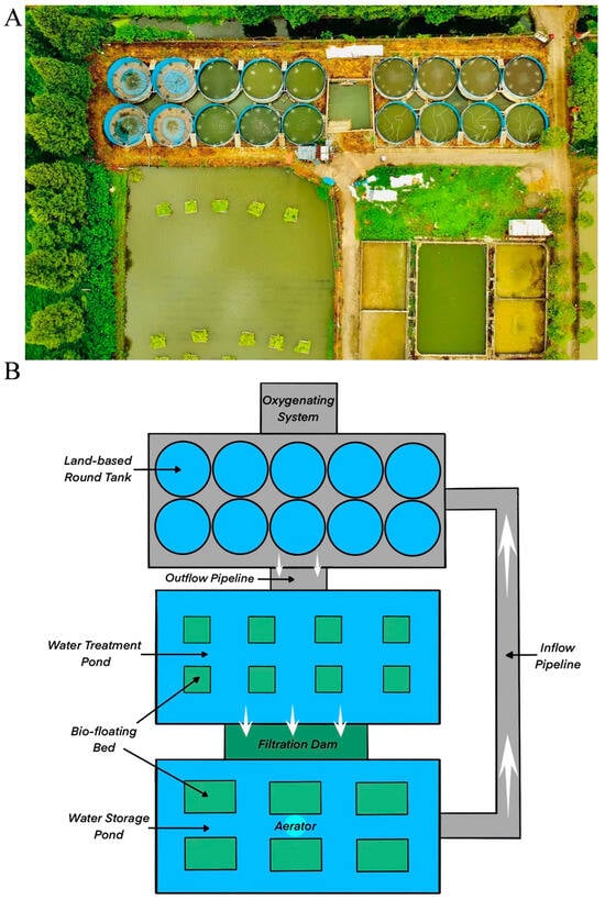 The land-based aquaculture system. (A) Bird’s-eye-view of land-based tanks integrated with water treatment pond. (B) Diagrammatic representation scheme of a land-based aquaculture system.