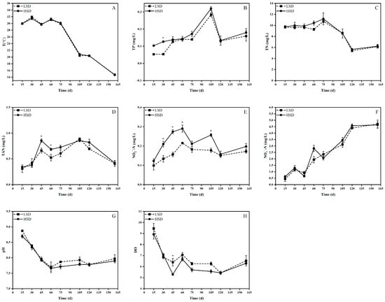 Water quality variations in the cultivation of juvenile gibel carp at different densities. (A) Chang in T; (B) Chang in TP; (C) Chang in TN; (D) Chang in TAN; (E) Chang in NO2−-N; (F) Chang in NO3−-N; (G) Chang in pH; (H) Chang in DO. An asterisk (*) was used to highlight statistically significant differences (p < 0.05).