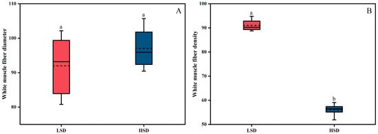 Effects of cultivation density on the diameter and density of white muscle fibers in juvenile gibel carp. (A) White muscle fiber diameter; (B) White muscle fiber density. Diverse lowercase letters denote notable variations in significance.