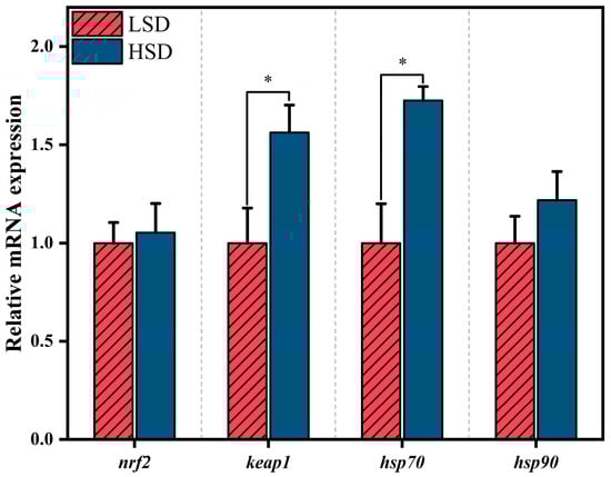 In gibel carp, the expression of keap1 in white muscle was significantly upregulated in the high stocking density (HSD) group (p < 0.05). Similarly, hsp70 expression was significantly upregulated in the HSD group (p < 0.05). Stocking density differences led to differential hsp70 expression in white muscle, with significantly higher levels in the HSD group (p < 0.05). However, nrf2 and hsp90 expression levels did not significantly differ between the HSD and low stocking density (LSD) groups (Figure 5).