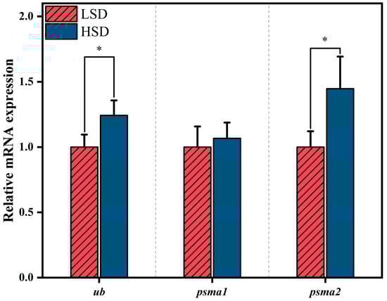 In the dorsal white muscle of gibel carp, ubiquitin (ub) expression was significantly upregulated in the high stocking density (HSD) group. Similarly, psma2 expression was significantly elevated in the HSD group (p < 0.05). However, psmc1 expression did not significantly differ between the HSD and low stocking density (LSD) groups (Figure 6).
