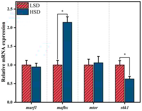 The expression of muscle protein metabolism-related genes: In gibel carp, the relative expression level of mafbx was significantly elevated in the high stocking density (HSD) group (p < 0.05), while s6k1 expression was significantly upregulated in the low stocking density (LSD) group (p < 0.05). The expression levels of murf1 and mtor did not show significant differences between the two groups (Figure 7).