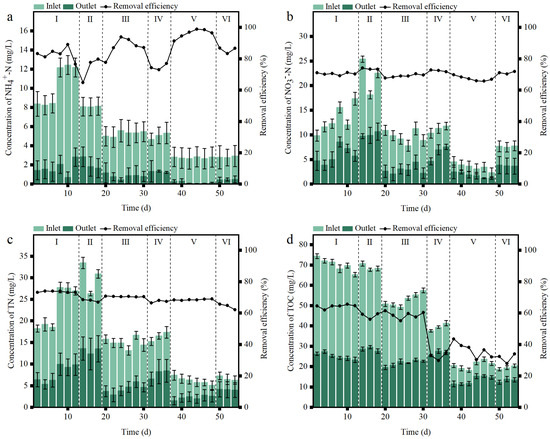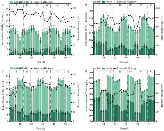 3.2.1. Effect of Pollutant Loading on the Pollutant Removal Performance