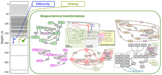 The two-dimensional benthic–pelagic model (2DBP) simulates the vertical and horizontal transport of particulate and dissolved matter in the water column and upper sediments at small horizontal scales [22]. In this study, we employ only a one-dimensional approach, dividing the water column grid into layers of variable depth (1 to 100 m), with an increasing resolution in the pelagic redoxcline (Figure 1). Vertical transport results from two mechanisms: vertical diffusivity and particulate matter sinking. Vertical diffusivity is estimated from temperature and salinity data using the Gargett formula (Equation (1)) [35].