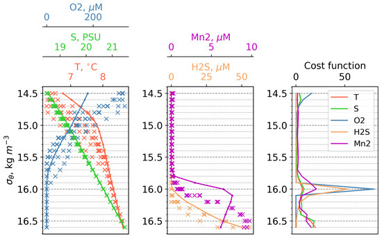 Left and center plots: First vertical distributions of temperature, salinity, dissolved oxygen, bivalent manganese, and hydrogen sulphide in density coordinates. Lines refers to model data, “x” to observations of the expedition on the RV “Knorr” in March 2003. All data interpolated on the same density levels. Right plot: Vertical distributions of cost function for salinity, dissolved oxygen, bivalent manganese, and hydrogen sulphide in density coordinates.