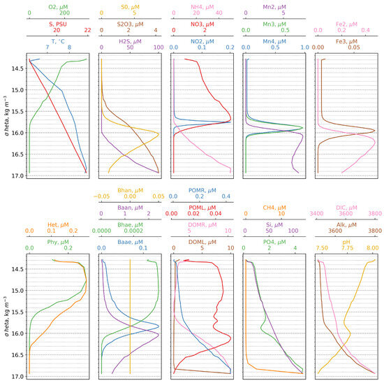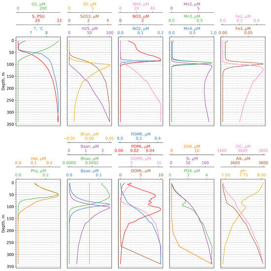 In the model, the suboxic zone, where hydrogen sulphide and oxygen are absent, can be found between a 90 and 105 m depth. S first appears at around 70 m, peaks at 105 m with a value of 10 M, and then decreases to 2 M at 300 m, which is within the range of values observed in the Black Sea [42]. Thiosulphate, an intermediate product of sulphate reduction and sulphide oxidation, appears at 60 m in the oxic zone and increases to 6 M at 300 m.