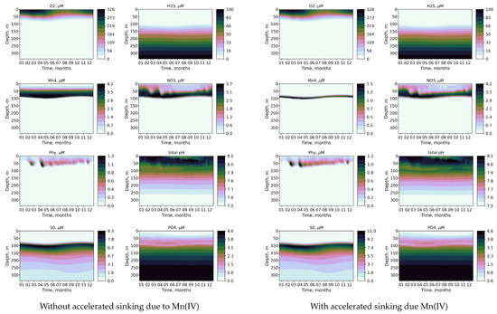 Calculated seasonal variability of O2, H2S, Mn(IV), NO3, Phy, pH, S0, and, PO with accelerated sinking due to presence of Mn(IV) (right column) and without accelerated sinking due to presence of Mn(IV) (left column).